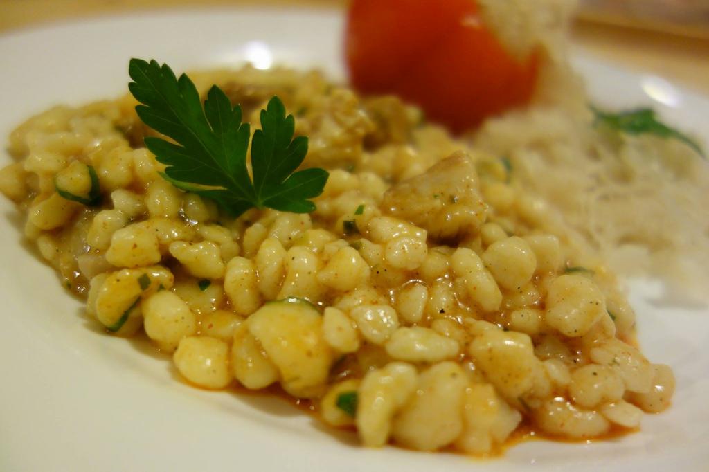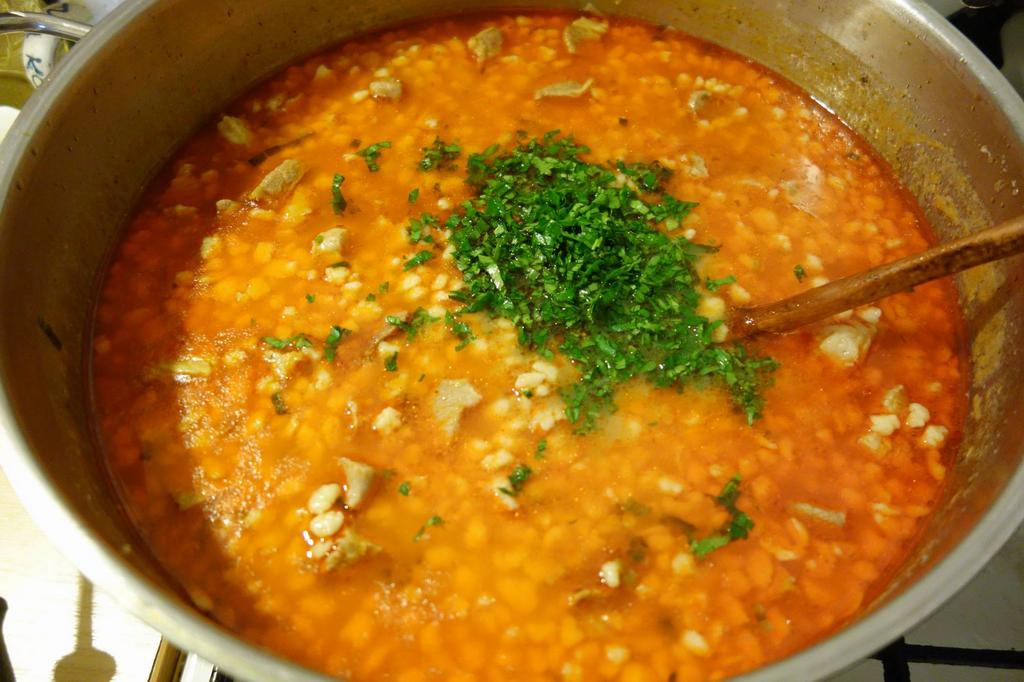 Când carnia îi mai gata pui doi-tri pumni die razalăi, amesteci binie și vez cam cum-îi cu apa, mai pui dacă trebe, da apă caldă. Hierbe încet până-s buni și razalăii și mâncarea o scăzut așe cum îț place. Iei di pă foc, pui petrinjei verz cât die binie și pui on fidieu care vujeștie binie pă laboș. Lași așe on ptic să să mai umfle razalăii. La pusu-n blid, așe-i punie cum îi vre! Da musai să ai lângă razalăi curethi pus în thipăruși, morat! Poț punie și curethi morat din cadă, o castraveț.
