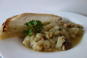 Ciapa o-ai corățât după ce o-ai lăsat o vreme-n apă, cum ț-am spus. Să ai opt-zece ciepe, așe cam ca on uou die mari. Tai feștecare ciapă pă lung ș-api o tai scrijele nu tare subțâri. A hi vremea să tai și maiu coștie și-l pui păstă ce friji în laboș. Amu pui și ciapa, tătă diodată, așe gămadă, n-o împrăștii. Mai pui sare, thiperi, pui fidieu pă laboș și lași să să frigă ușurel, ușurel. Din când în când tie mai uiț la tocană, amesteci și mintienaș pui iară fidieu și tăt așe o lași. Nu pui apă, nu pui mnică. Uniele muieri di pân sat, puțânie, punieu ș-on strop die poprică dulce. La noi în casă nu s-o pus veci! I și păcat să feștești tocana aiasta, numa’ scliptiește, așe faină și tistașe îi! Și nu trebe să-i știmdi cu nimnic gustu die ciapă. Să face o tocană scăzută, duuulce de-ț linji jejitile! Asta o făciem în tătă sâmbăta când tăieam una, duoauă galiță.