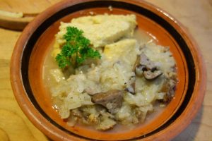 O mânci cu ptită caldă o cu lângalău. Și cu mămăligă-i tare bună! Noa, ia ca-i mai făcut o mâncare și nu ti-ai tieltuit tare! Noi așe-i zâcem, ciapă friptă cu măruntaie. Aiștia din satul di lângă noi, din Vârșolț, îi zâc ciapalău. Noa, carecum…