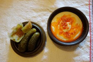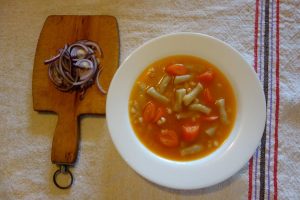 Cân nie nimeriem pângă dumniaii, măicuța nie puniea înt-on blid mai afundos doi pumni die pui die păsulă hierț, tăiea mânânțăl păstă ii o ciapă, tri jejitie die sare și thiperi și le amesteca cu tri hire die oloi die ruje. Ș-aceie ierea o mâncare, nu? Și tare bună! Noa, amu începe zolitu’! Nu poci să zâc că-i tare greu, da trebe să nu tie grăbdiești, ai on ptic die lucru! Zdrobdiești binie, binie păsula. Diodată cu păsula zdrobdiești și ciapa, după ce i-ai scos cotoru. Mai zdrobdiești și perile, aiu, ba poț zdrobdi și on morcod, die-ai pus la hiert mai mulț. Le tosoniești tăitie binie și începti să le treci pânt-o strecurătoare. În casă la noi îi zâcieam la strecurătoare lășcar. Da știi di ce? Făcieam dies laștie strecuratie. Cu brânză mai ales, da și cu curethi, o’ ptiar cu silvoiță. Noa, strecuram laștile pân lășcar! Noi avieam duauă strecurători die lut, jumulțâtie, bugăt die mari iereau, că le folosam și la silvoiță după prima hiertură, să scoatiem sâmburii. Avieam duauă strecurători, cum-îț spui, una mai rară și ceielaltă mai diasă. Le folosam la păsulă pă rând, mai naintie pă aceie rară, asta aviea hudiele mai mari. Strecuram odată ș-api trecieam păsula în ceie mai diasă. Trebe să tie folosăști și die o țârucă die zamă când strecori, nu multă, să nu faci păsula pe subțâre, n-o faci liurcă!