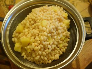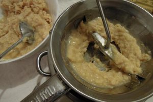 Amu voi aveț tăt felu die strecurători, ptiar ti-am văzut când ai făcut zama die porodici pântu iarnă, mândră strecurătoare ai, die plev. Cu aceie numai’ tir joci, nu tie canunești, o dată zolești păsula! După ce-i strecurată păsula, o coț die sare, zdrobdiești păstă ie doi tri cățăi die ai, uări îi dai pă razalău mnic, cum vrei. Ai pus aiu și tie pui să zolești binie-binie păsula, da tăt torni oloi die ruje, nu tare mult, da-i vidie cum să aldieștie și cum să umflă păsula! Noi o zoliam c-on mestecău die lemn die brad pă care mni l-o făcut Hilimonu mnie. Ț-oi arâta mestecău ista. Voi aveț amu cu ce amesteca… Așie die cinașe iesă că nu tie poț țânie și odată baji o coajie die ptită în ie și o cuștulești, că nu poț face die mâncare fără să cuștulești, așe-i? Păsula zolită îi cam gata. Amu die-i post, o mânci așie numa’ c-on pârgălaș die ciapă cu poprică dulce. Tre să ai și morătură! Pârgălașu’ ista să faciea fel și fel. Ț-am mai spus, îl faci cum îț place. Die nu-i post poț frije on dărab die clisă uări on dărab die cărnaț, uări și die una și die alta. Mâncata-i tu păsulă zolită cu lângalău? Mâncat dară, numa’ io ț-am dat die bugăitie uări! Ca și cu lângalău nu-i cu mnică!