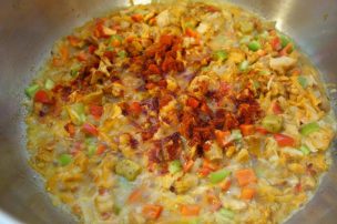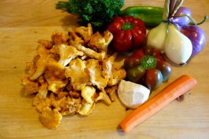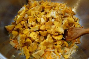 -Noi n-avem tăitiecele ca voi, da tăt binie le corățăm. Amu c-ai gătat și ceapa și ciuciulețîî, punie-tie și răzălești on morcod ș-on dărăbuț die țeler. Noa ni că le avem pă tăitie! Numa trebe să le puniem p-olaltă. Vezi tu laboșu ista? Ii numa bun că-i gros la fund și are on fidieu care vujeștie binie. Pui o lingură die oloi și mintenaș pui și ceapa. O cârcălești on pticuț, pui ce-ai răzălit tu, adeca morcodu și țeleru… amesteci la foc molcuț, poț punie o țâră die sare ca-pi mai lasă apă și nu să ard. După ce să moaie aieste și pui ciuciulețîî. Iară amesteci să moaie și aiștia și pui poprica tăietă, mai coț die sare și pui ș-on colb die poprică măcinată, dulce. Sloboz on deț die apă ș-o lași așe în treaba ii, nu tie sorgoșe, pui fidieu p-olăture, n-o astupti die tăt.