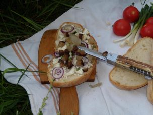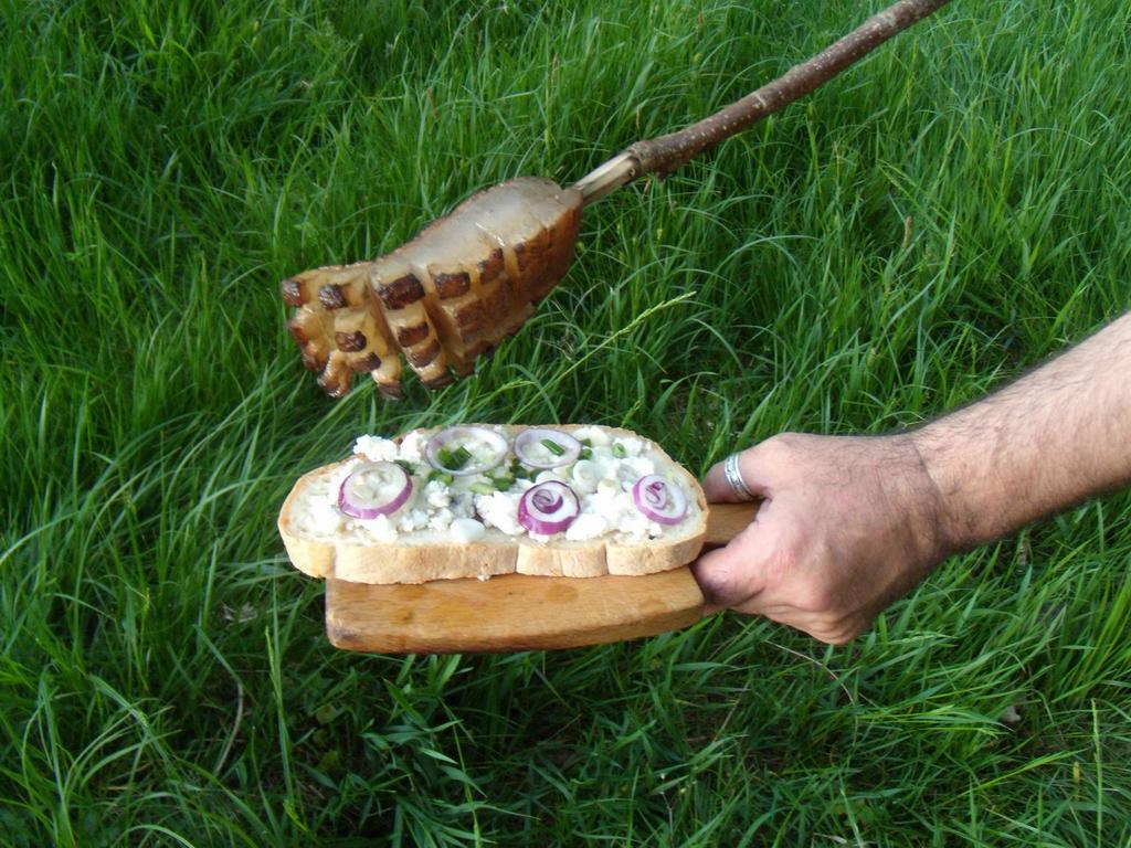 Mai nainte, să hii pregătit cu o scrije bună die ptită die casă, tăietă așe mai grosuță. Sfarmă pă ie on pumn die brânză die oaie și mai taie o ceapă păstă brânză, n-o mânânțăli tare ceapa… Coată o botă dreaptă die prun o die alun, cam de-on metăr. Dacă are la on capăt on crac a hi și mai bună. Curăță partea ceie cu cracu die coajă, ca să nu amărești clisa, și ascuțăști vârfurile cu brișca.