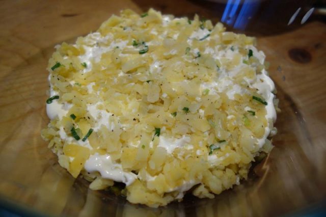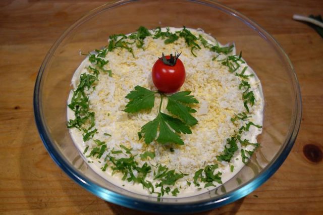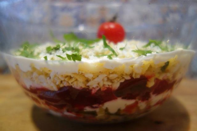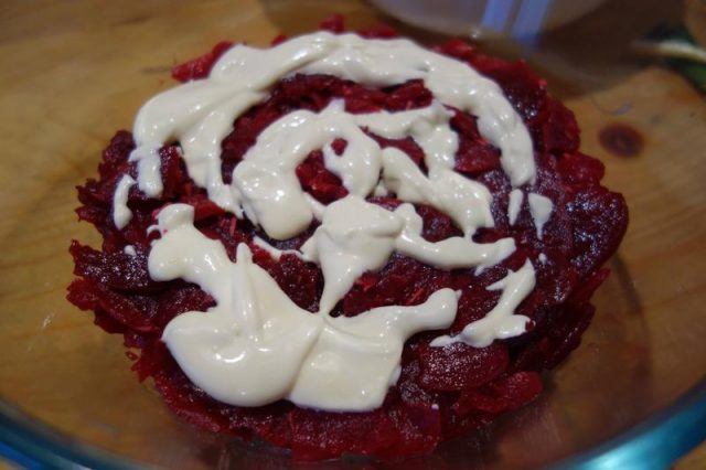 Noa, amu tie pui și le așez pă tăitie aieste înt-on castron, le pui în straturi di-a rându, colompire, maioneză, ogârcăi, maioneză, sfeclă, maioneză, uoauă, maioneză, iară colompire, pui păstă iele iară maioneză și amu răzălești cu grije pă răzălău mânânțăl uou pă care l-ai lăsat dietilindi. Poț punie, așe, die țifrușag, poț punie petrinjel verdie.