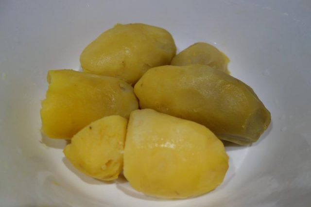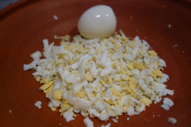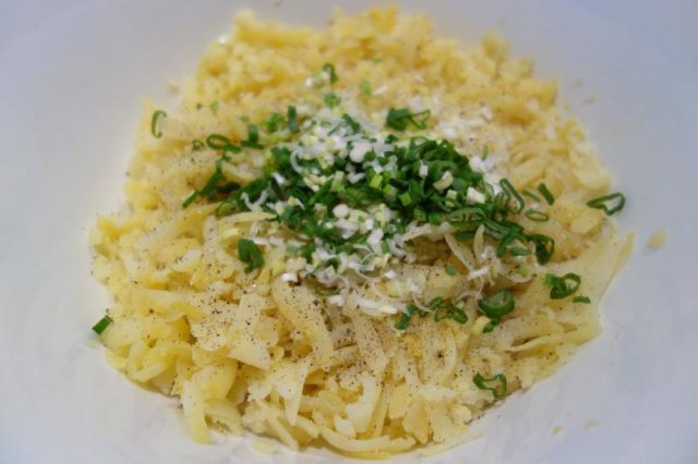 ” – Pui la hiert tri-patru uoauă și, tăt așe, tri-patru colompire. Corățăști uoauăle și le răzălești pă răzălău mare, tri din iele. Pă unu îl lași diopartie, camdiodată. Tăt așe faci și cu colompirele, le corățăști după ce o hiert și le răzălești. Speli și tai mânânțăl patru hire die ciapă verdie. Die nu ai verdie poț tăie o ciapă uscată. Mai răzălești tri ogârcăi moraț cum ț-ai pus pă iarnă. Amesteci colompirele răzălitie cu sare, thiperi și ciapa tăietă. Tăt așe amesteci cu sare și thiperi și răzătura die uoauă.