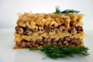 ”Noa, văd că ț-ai făcut razalăi până-i lume! Da ț-o și ieșit tare mândri! Ti-ai învățat, nu zâc mnică… bistoș îi face oareșce ciolent. Amu, dacă tăt ai făcut atâța razalăi, ț-oi spunie cum să faci cureti morat cu carnie și razalăi. Ai făcut tu piroștie împrăștiete după cum ț-am spus, rakott kaposzta cum zâciea Jzujzi neni, mă-sa li Erzsi. Amu tăăt în felu ala poț face și cu razalăi în loc die rișcaș. Nu tătdiauna iera în casă rișcaș, făcieam cum putieam și nu nie celuieam la nime! Tăt așe-i face numa’ că cu carnia ti acupa înt-on altu fel. Carnia o tai cu cuțâtu nu o baji pân moșina die tocat. O tai coștie cât poț die mânânțele, da’ numa’ cu cuțâtu. Aleji carnie mai grăsuță die porc, bun-ar hi di pă la grumazu porculi. Carnie crudă, nieafumată. Da’ mai tai tăt așe și on dărab, cam cât palma, die pecie o die șoancă afumată, carnie macră, nu cu ciont. Nu ti tieme, odată o tai die ai cuțât bun! Hilimonu mnieu așe tăiea tătă carnia pântu cărnaț când tăieam porcu’. Așe o tăiea, da nu cu cuțâtu, nu, o tăiea cu o săcuriță care numa’ pântu aista lucru o țâniea! O săcure mai mnică, da lată la gură, cam cum iera plencacia cu care ciopliea grinzâle die lemn. Așe iera, ca plencacia, da mai mnică cum îț spui.