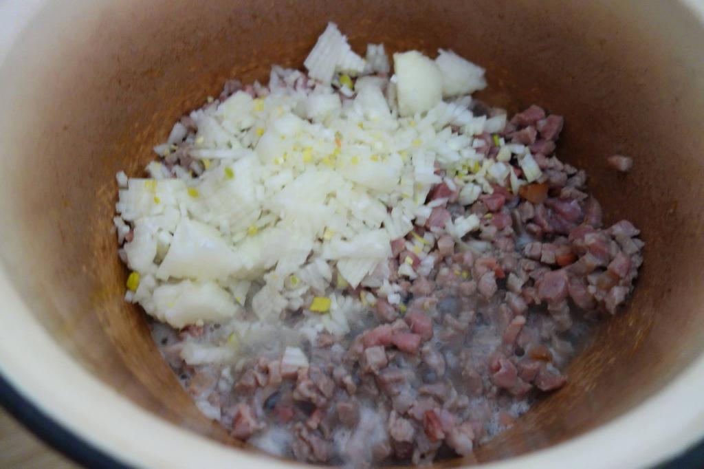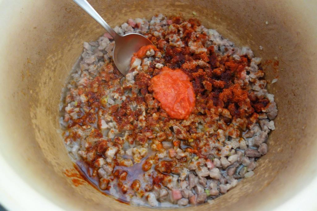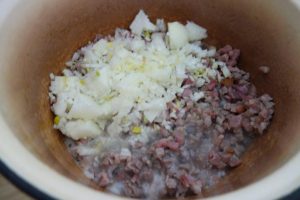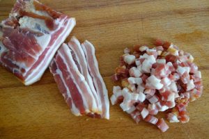 Nie punieam amândoi să tăiem carnia pântu cărnaț. Io tăieam carniea scrijele subțâri și iel cu săcuria o mărunțiea p-on butuc die lemn mai mare și nalt așe ca masa. Ș-aista, butucu, numa’ pântu carnie iera. Tăt așe tăieam și măruntaiele hiertie pântu călbaj. Di ce-ț spui io să faci mâncaria asta așe, cu carniea tăietă? Știi di ce-ț spui? Numai’ să-ț dai die samă cum a hi, cu tătu și cu tătuli alt gust. Nu poci să-ț spui di ce, da, cum îț spui, altu-i gustu, noa! Vez tu? Numa’ din felu cum tai carnia și altu-i gustu. Ai tăiet carnia, seperat o tai pă una și pă alta, o și pui dietilindi pă ceie afumată că cu asta începti. Pui în laboș oloi și unsoare, friji die-nceput pecia afumată, amesteci binie, o friji binie.