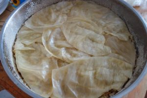 Amu le pui în laboșu cel gros, le pui în straturi. Laboșu l-ai uns naintie pă di-nlontru cu unsoare. Așe cum-îi uns, țâpti în iel on pumn die prezli și întorci laboșu să să lipască prezli păstă unsoare. Diabdie amu poț punie în laboș ce ai die pus. Împărțăști curethiu în tri, tocana și razalăii în duoauă. Pui în straturi ce ai, începti cu curethi și gheț cu curethi. Și la mnijloc pui on strat die curethi că doară di-aceie p-aista l-ai împărțât în tri. Noa, gata! Die ai la-ndămână on păhar die zupă die găină o die pui, punie-l să să scurgă pântre straturi. Die n-ai, punie apă caldă, binie-a hi ș-așe. Păstă tăt ce-ai pus întinz tri-patru frunză întreji die curethi și numa’ dup-aceie pui fidieu’ pă laboș. Baji în ler laboșu, așe coperit cu fidieu. După on cias scoț laboșu și-l baji napoi da fără fidieu. Tie uiț după o vreme cam cum-îi, tre’ să să scorțălească o țâră pă diasupra. Când îț place cam cum coată afară, mâncarea-i gata!