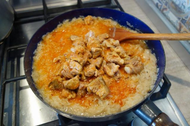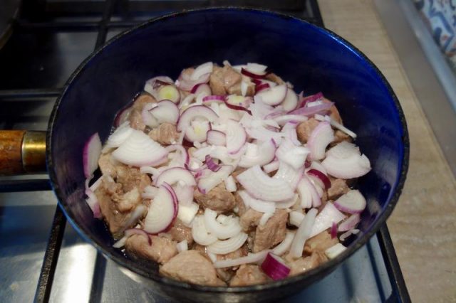 Tai carnia coștie, cam așe ca di-o îmbucătură. Pui unsoare înt-on laboș și friji carnia binie, tai tri cepe și le pui să să frigă păstă carnie, amesteci, pui sare, thiperi și o țârucă die apă caldă. Nu uita să pui și poprică dulce! Lași să hiarbă încet până carnia-i gata, tre să hie moale da să nu să zdrobască.