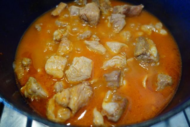 După ce ai fript curethiu, pui păstă iel carnia friptă, amesteci și mai dai on clocot bun laolaltă. Die crez că trebe mai pui apă caldă. Mâncarea tre să hie mai zămoasă. Die vrei, amu poț punie la hiert și o lingură die groștior. Amesteci și lași așe să hiarbă cu tătuli cu groștior. Da’ nu-i musai să pui groștior, faci cum îț place. Cu groștior uări fără groștior! Die faci cu curethi dulce, pui în mâncare, la ultimu clocot, on păhăruț die zamă hiartă die porodici.