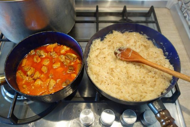 Dietilindi, înt-o lespedie mai afundoasă, pui iară unsoare, adauji o lingurucă die chimin și lași să să frigă on pticuț chiminu ista. Pui în unsoarea asta să să frigă curethiu pă care l-ai tăiet mânânțăl. Cam on blid die curethi pui. Amesteci și friji curethiu cu grije până să moaie. Pui apă caldă numa’ atâta câtă trebe. Câtie-o țârucă, câti-o țârucă! Die-i curethi morat nu pui sare, numa’ oarece thiperi. Die faci cu curethi dulce, după ce l-ai tăiet, îl freci cu sare și-l lași o vreme să să moaie, îl storci și abdiea dup-aceie îl pui în lespedie.