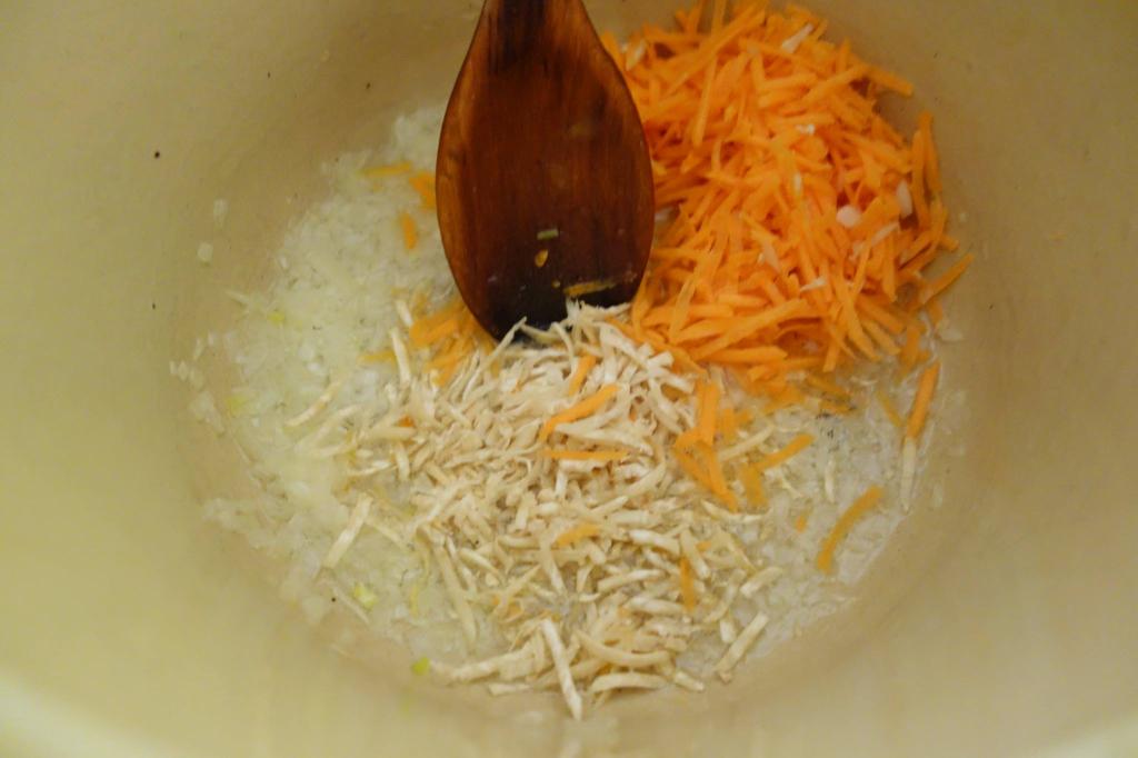 Primu fel îl faci cu ciapă, morcod și țeler, câti-on dărăbuț. Le corățăști, le speli, ciapa o tai mânânțăl, mânânțăl, morcodu și țeleru le răzălești pă razalău’ mnic.
