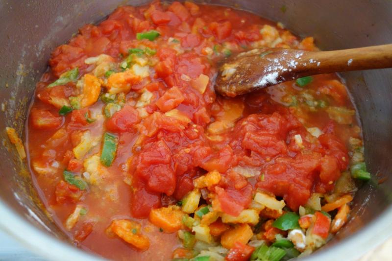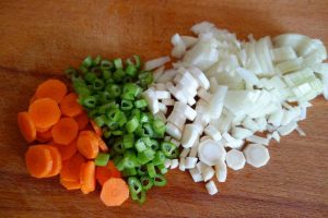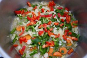 Pui păstă ciapă zărzăvaturile, le cârcălești și pă iele, pui api thipărușa și duoauă căciulii bunie die ai, di-aista die iestim. Tai aiu mânânțăl. Le mai friji ce le friji cătolată și pui o lingură die fărină, o țâră die poprică dulce și mintenaș păstă iele pui tri poridici pă care le-ai opărit, le-ai cojit și le-ai tăiet mânânțăl. Die vrei, poț da porodicile pă răzălău mare. Amesteci porodicile cu ce ai în laboș, ai die grije că să cam îngroașă zoaftu di la fărină! Mai tomniești mâncarea cu o țâră die apă hierbintie, apa în care ai hiert păstăile. Atâta apă pui cât să să subțâie mâncarea, da să tie sămălești că-i punie și păstăile hiertie. Ptiar așe și faci!
