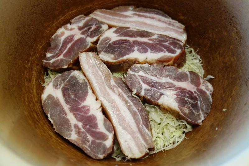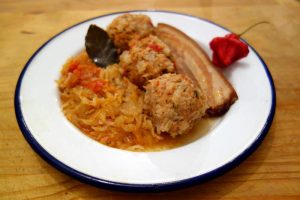 Friji în oloi o ciapă tăietă mânânțăl, pui o finjie die zamă die porodici, mai pui sare, thiperi, cimbru. Coată die sare! Vez după cum îi die sărată afumătura uări curethiu, dacă-i morat. După ce ai hiert zoaftu mai pui apă caldă câtă crez că trebe să pui în oală. Poț punie, în loc die zoaft, moare îndoită cu apă, faci cum vrei! Pui ș-on blid întors păstă curethi, mai pui fidieu și lași să forcotiască oala cătingan. Când curethiu s-o muiet și carnia tre să hie gata! Când pui în blid poț punie, la care vre, o ligură die groștior.