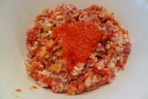 ”Aista fel die piroștie l-am văzut la Zsuzsika neni, mama li Erzsike, asta di păstă drum. Zsuzsika neni mnio zâs că o văzut cum să fac pă la Valea lui Mihai, când o fo iea pă acolo nuștiu pă la cinie. Îț trebe on dărab die carnie mai grasă, die porc, di su pântece. Tai carnia asta coștie. Mai corățăști și tai o ciapă bună ș-o thipărușe roșie dulce. Le tai p-aieste mai mărișoare și le friji înt-o lingură die unsoare, atâta le friji cât să să moaie binie. Le lași o țârucă să să răcorasă și le amesteci cu carnia pă care o-ai tăiet. Mai pui sare și thiperi cam cum gâniești.