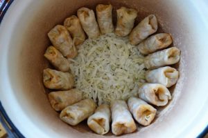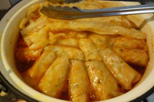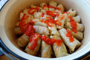 Mai pui cimbru, poprică, o’ în loc die poprică pui thipărușe tocată, ce ai. Binie-ar hi să pui și petrinjel verdie cât die mult, tăiet, o’ morareu verdie. Die ai, die n-ai, n-ai! Le amesteci tăitie aieste binie, cu tăt cu scoarța ceie di pă laboș că nu-i arsă. Curetiu să hie pregătit din vreme și începti a împocăli piroștiele. Asta nu-ț mai spui cum să le faci că ț-am tăt spus ș-ai mai făcut. Pregătești oala în care li hierbe, o podiești la fundu’ ii cu crenji mai mnici die morareu și cimbru ș-api le astupti p-aieste cu cureți tăiet mânânțăl. Pui tri linguri die oloi și o țâră die apă să nu să prindă. Poț începe a așeza piroștiele în oală! După ce le-ai pus pă tăitie în oală, mai pui on păhar bun die zamă die porodici, umpli oala cu apă caldă până-n dreptu piroștielor, coperi binie cu tri, patru frunză die cureti și mai pui păstă iele on blid întors cu fundu în sus, să le țâie on ptic apăsatie.