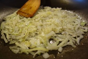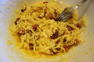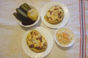 Înt-on blid mai afund baț binie tri uoauă, mai pui în uou sare, thiperi și poprică dulce. Pui păstă uou’ bătut coștiele friptie die șoancă și mai răzălești on dărab die caș die oaie, mai gras și uscat. Amesteci binie uou’ bătut cu șoanca și cașu și-l împarț păstă ptita cu ciapă. Pă mnijlocu feștecarei scrijea die ptită poț punie și câtio roată-duauă die ciapă crudă. O muiere di cătă Șimneu, di la Pericei, mni-o spus că iea așe face ptita cu uou. Noa, baji tăpșia-n ler și mintenaș îi gata prânzu!