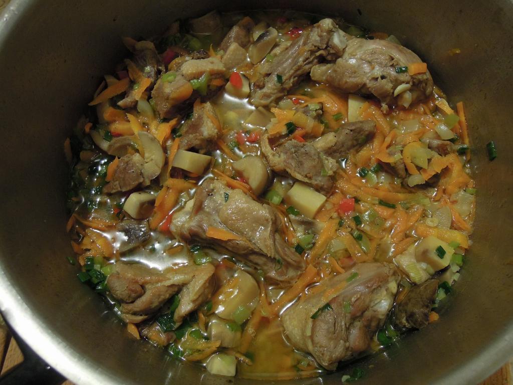 Tai rața în dăraburi potriditie. Din aripti, spatie, spatiele cu cur cu tăt, ala-i cel mai dulce, labe, grumaz, faci o zupă cu multie zărzăvaturi, că ț-a trăbui la rișcaș. Pui carnia și o friji cu oloi, da nu mult, că lasă și rața unsoare. O friji așe încet, încetuț. Iestimp, răzălești on morcod, tai mânânțăl o ciapă, verdie o uscată, die acarcare, oareșce thipărușe roșie, die ai, le pui și pă aiste păstă carnie, le friji di-o-npreună și pui tri finjii die zupă, că di-abdie o-ai făcut. Să ai la-ndămână o finjie die rișcaș, aleji gozurile din iel!