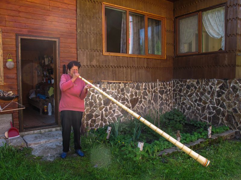 Pe vremuri, oamenii nici nu prea coborau de pe dealuri, şi când vroiau să se anunţe de una sau alta, luau la mână tulnicul şi scoteau sunete numai de ei ştiute şi înţelese. Acuma’ nu mai ştie lumea nici de tulnic, îl ţin doar de muzeu. Doar tanti Sofia, ce a fost învăţătoare, îl mai scoate când şi când şi cântă la el crâmpeie de acorduri moţeşti transmise din bătrâni, ca să-şi bucure oaspeţii. Nu e deloc uşor să scoţi sunete din tulnic, şi toţi care încearcă se lasă repede păgubaşi, dar tanti Sofia a învăţat când era copil şi mergea cu vitele la păscut pe dealuri la Panteşti. Multe tulnice a prădit şi ea până a reuşit să înveţe, dar nu s-a lăsat păgubaşă. Trebuie să-ţi ţii buzele într-un anumit fel şi să împingi aerul cu forţă, lăsând sunetele să se rostogolească prin lemnul de brad, până ţâşnesc la suprafaţă. A încercat să-i înveţe şi pe copii, dar nu prea a reuşit, că-ţi trebuie multă răbdare şi exerciţiu. Într-o cămăruţă şi-a încropit şi un muzeu, unde a tot strâns la obiecte de tot felul dar nu îl deschide decât atunci când ştie că are cui îl arăta. Acolo ţine tanti Sofia şi iile, trăistuţele şi costumele populare cusute de ea. Şi chiar dacă oamenii precum badea Gheorghe şi învăţătoarea Sofia cu respect pentru meşteşugurile şi tradiţiile cu care au crescut atâtea generaţii de moţi sunt tot mai puţini, acolo sus, pe dealuri, Ţara de Piatră şi-a păstrat farmecul. Iar dacă ai timp să stai să priveşti şi să asculţi, ai să vezi căsuţele cu acoperiş ţuguiat ale moţilor, în care, în urmă cu 40 de ani, mai trăiau încă familii cu trei generaţii şi în care acum au rămas doar ultimii păstrători de tradiţii autentice. Ai să vezi căprioare adăpându-se la izvor, cai alergând liber cu coama în vânt, fremătând libertatea în nări, ai să auzi ursoaica ţinându-şi puii aproape şi lupul chemându-şi haita, şi dacă ştii să mergi fără să tulburi natura, poate ai să vezi şi râsul.