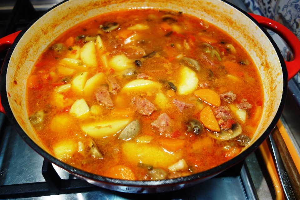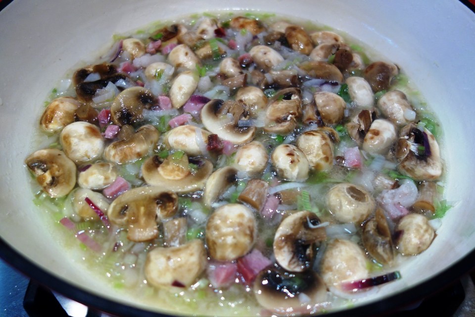 Speli binie, binie burețîî și-i tai în tri-patru, care cumî-i die mare. Noa, le ai pă tăitie pregătitie! Tie apuci și faci tocana. Dacă nu iera post folosam la tocană o scrijea die clisă afumată cu care dădieam gust cî die cât. Clisa nu lipsa păstă vară din mâncare! Așe o țânieam să trecem și vara cu clisa că o punieam ba în zămuri, ba în tocanie, ba în piroștie. Ala iera gustu die carnie tătă vara! Tai mânânțăl clisa. Bistoș că tu îi punie on dărăbuț die pecie afumată, numa di-aceie că tu a pecie! Pui o lingură die unsoare în laboș și friji clisa. Pui păstă clisă ciapa și aiu tăietie, pui și sare. Amesteci și le cârcălești laolaltă. După ce s-o muiet ciapa, pui burețîî, cam on bliduț die bureț pui. Poatie amu a trăbui să pui o țârucă die apă caldă. Nu tădiauna trebe, după cum lasă apă ciapa și burețîî…Amesteci, și poț punie și coadile verz di la ai și di la ciapă și mai pui zărzăvatu pă care l-ai corățat și l-ai tăiet… Pui o lingurucă die poprică dulce păstă mâncare. Adauji thipărușa tăietă, amesteci și pui înt-on drept cu iele apă caldă.