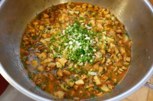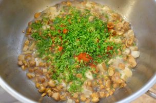 Punie, die ai, o lingură die poprică dulce. Die nu ai nu-i nicion bai… lasă-le așe pă fitieu cătă o marjinie, tu taie mânânțăl în vremea asta on pumn bun die petrimjei. Naintie die i-a țâpa păstă topală, vezi die sare, poț punie și tri jejitie die thiperi. Amestecă binie, lasă să hiarbă așe mai cătingan și tu taie tri hire die ceapă verdie, așe roatie mnici și amestecă-le cu topala.