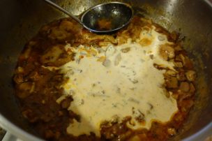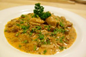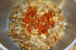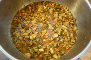 Scoț carnea friptă di-opartie înt-on castron și-l coperi să steie așe mai cald. În oloiu ce-o rămas tie pui și friji ciuciulețîî și mai pui ș-on pumn- doi die hiribe. Die ai oiță uări creasta cocoșuli, punie-le și pă iele. Frije-le cu grije, nu tie zoli, că nu țî sorgoș die nimnică, când lucri, api lucri! Noa, așe! Îi vide că nu-ț trebe apă defel. Pui o lingură die poprică dulce și petrinjei cât die mulț. Amu pui napoi carnea friptă pă jumătatie, amesteci și, tăt așe, focu molcom, încet, încetuț să fac iele binie. Nu-ț trebe nicio îngroșală.