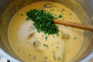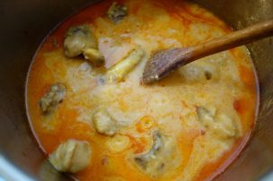 Amu, musai să stai tăt lângă laboș să amesteci și să vezi să hie focu moale. Lași așe să hiarbă cătingan cătă on sfert die ceas… când îi gata, mai pui on pumn die petrinjei tăieți binie.