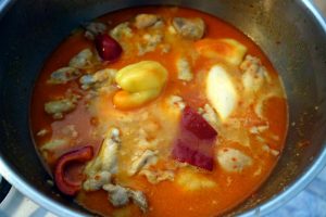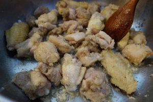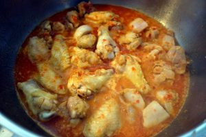 Noa ni cum făciem: tăiem on pui bun, gălbânuț, tăiem carnia dăraburi potriditie. Lasă și cioantie că alia dau gustu la topală! Pui păstă carnie sare și thiperi, mai pui o lingură bună die fărină, scuturi castronu să să-nvăluie binie carnia cu fărina. Poț folosî și fărină die mălai, da s-o treci pân sâta diasă să nu hie prundoasă. Pui pă foc bădicu cel gros die hier, pui oloi și friji carnia pă tăitie părțâle, tăt amesteci, amu focu trebe să hie aspru, să face carnia galbână ca mândrenia, ca auru să facie. Traji bădicu pă marjinie, pui on colb die poprică dulcie, amesteci, pui o finjie die apă rece și numa dup-aceie traji iar pă foc, da foc mai molcom. Tăt pui apă rece, tăt amesteci, zămuca di pă carnie să tăt îngroașe. Atâta apă pui până să face o zămucă nici groasă da nici liurcă.