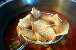 „Maica bătrână făcie pătura la noi în casă, până o perit, Dumnezo s-o iertie și s-o hodiniască acolo undie-i ie! Iera tare mânânțe, numa o mânușe die muiere iera, di-abdie ajunjie păstă masă să-nvârtă pătura. Până io făcut Hilimonu mnieu on scăunaș ș-api lucra mai binie. Noa, și câtiodată când tăie laștiele o’ tomajii din pătură, mai lăsa on dărab din ie, o întindie pă o față die masă ș-o lăsa oareșcâtie zâle în casa di cătă drum, acolo iera răcoare și mai întuniecos… ș-acolo să usca binie, binie, ca plevu să făcie. Când nie gândiem să facem oarece cu ie, numa o luam, o rupiem în dăraburi care-cum, le puniem pă ploaptăn o’ le băgam c-o tăpșie în ler. Le frijiem și p-o partie și pă alta, așe să făcie ca soru di pă porcu pârlit die Crăciun. Dacă le frijiem așe api atunci când le puniem în mâncare avieu cu tătuli alt gust…iera altăce! Noa, după ce le frijiem le puniem di-o partie și ni-apucam die topală.