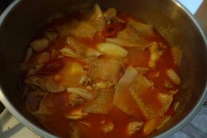 Nu uita că în zama aiasta trebe să-ncapă și pătura, așe că sămălești cam câtă zămucă faci. Tăt amu pui o ciapă corățată, întreagă, și patru, cinci scrijele die poprică, așe mai mari. Le lași așe să hiarbă tăitie laolaltă, încetuț, până să face carnia, da să nu să zdrobdească, ai numa die grijă. Iestimp, tie acupti die pătură. Pui înt-o oală apă cu sare la hiert. Când clocotieștie, sloboz pătura friptă și o opărești binie până să moaie, vez numa că ie mai hierbe o țâră și-n topală! Cătă când vez că-i binie o strecori ș-o pui în tocană. Die gâniești că mai trebe, poț lunji zămuca cu apa-n care-o hiert pătura. Die pui apă rece iară să-ngroașă!