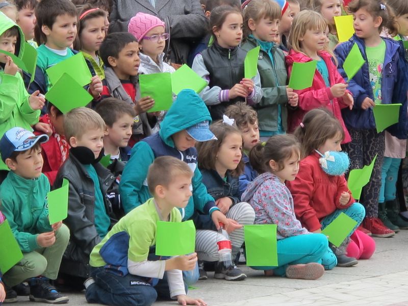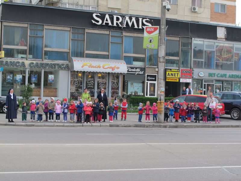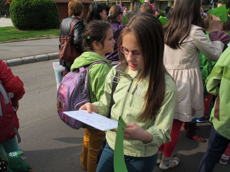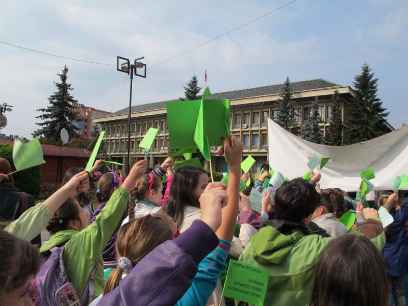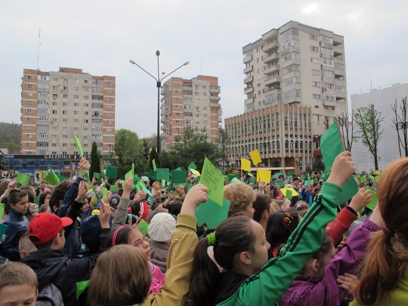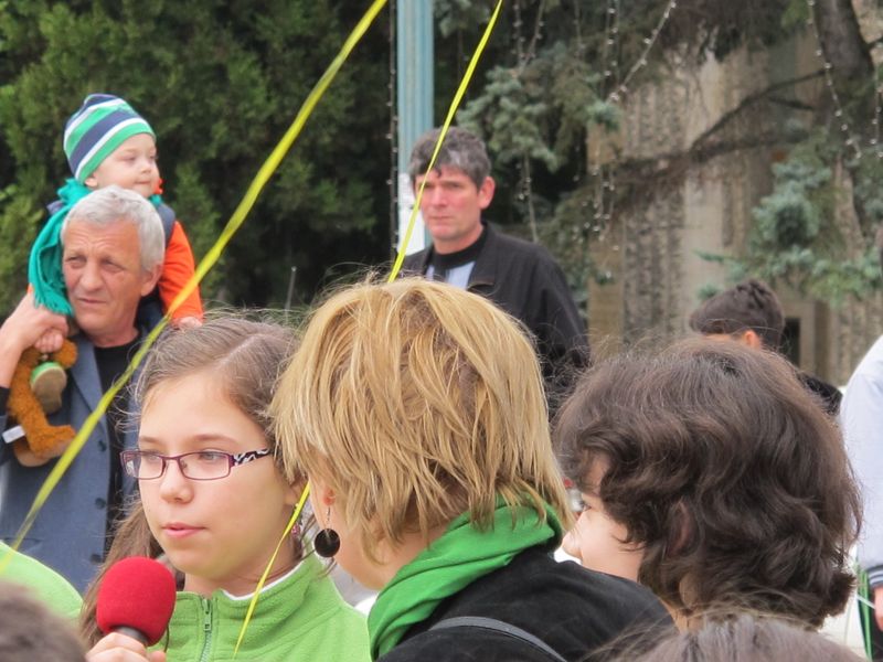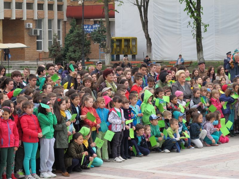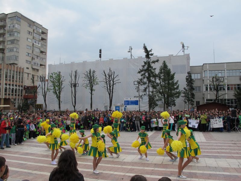 Într-un final, uriașul cordon cu reflexii verzi s-a oprit din mișcare pe platoul de marmură, acolo unde urma să aibă loc “ceremonia” de final, cu dansul majoretelor eco și luările de cuvânt. Și, evident, cu unii-alții, care, pentru că asta e fișa postului, au băgat microfoanele în gura persoanelor cu funcții, denaturând, cel puțin din punctul meu de vedere, scopul ecologic al marșului celor mici, transformându-l în material de presă în care semnatarul se așază deasupra participanților benevoli la eveniment, un fel de a spune “Vezi, lume, dacă nu eram eu acolo, cu microfonul sau pixul, n-ar fi fost nimic”. Însă meritul este exclusiv al organizatorilor, respectiv al ecoambasadorilor Școlii “Mihai Eminescu”, al celor implicați direct în toată voioșia asta cu mesaj ecologic. Pentru că e atât de ușor să devii parte dintr-un eveniment sau altul, alăturându-te, simplu, participanților. De pe margine nu e la fel. Oricum, totul s-a terminat atunci când baloane verzi au fost lăsate să se înalțe undeva deasupra mulțimii, cu privirile picilor ațintite la ele și cu vorbele profesoarelor șoptite discret celor mici: “Să nu lăsați hârtii pe jos, nicio mizerie, că sunteți ecoambasadori, da?”
