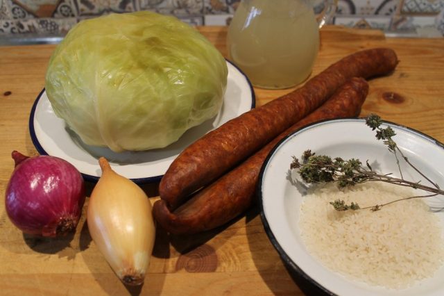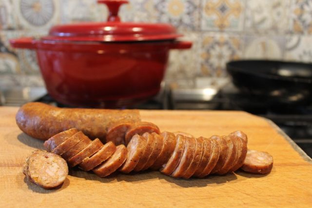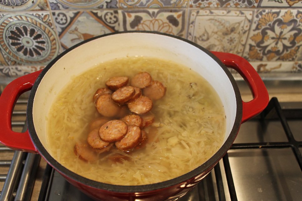 Până hierbe curethiu tai roatie subțâri on dărab die cărnaț afumat. Pui cărnațu în zamă. Amu pui și rișcașu.