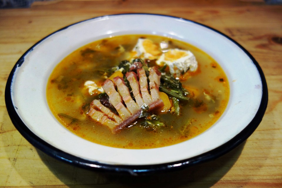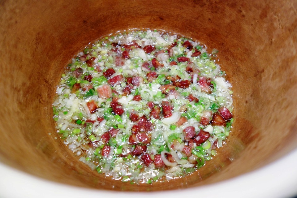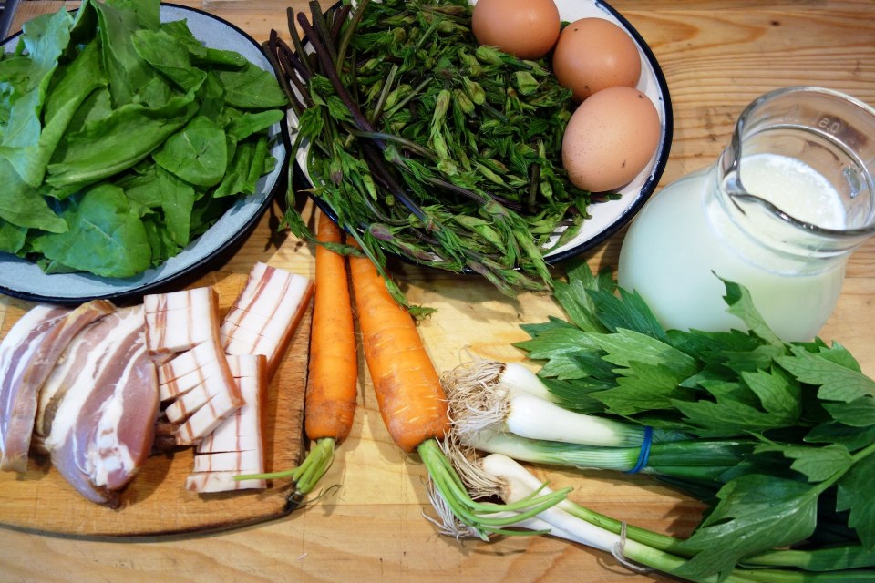 Pă lângă clisă și comlău îț mai trebe 2 morcoz, ai și ciapă verdie, frunză die leuștian, o mână bună die macriș, dacă ai, dacă nu ai nu pui că n-ai die undie punie!, jintuială îț mai trebe și tri, patru uoauă.