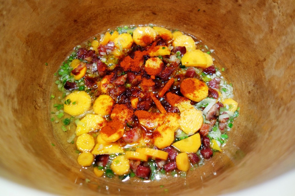 Adauji păstă pecia friptă ciapa și aiu, partia albă și, la o vreme, morcodu. Amesteci, lași să să mai frigă o țârucă și morcodu. Pui o lingurucă die poprică dulce și potolești cu apă caldă. Lasă loc și la jintuială!