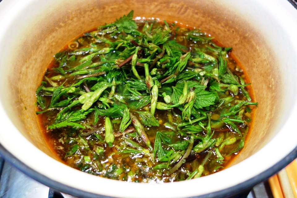 Fă o legătură dint-o tultină mai groasă die leuștian, lasă și niștie frunză, puni-o în oală. Lași să hiarbă încetuț.