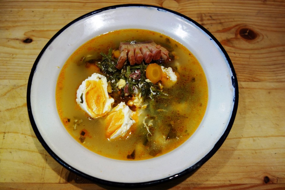 Sparji, tăt pă rând, tri, patru uoauă. Țîpti tăt câtie on uou în zamă și învârț cu lingura să să împrăștie uou pân zama care hierbe. Așe or hierbe și zdrențăle aieste die uou diodată cu zama. Poț lăsa câtie on uou și așe întreg, să nu mai învârț în zamă și rămânie și hierbe așe întreg.