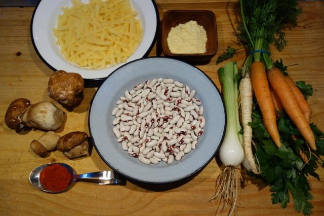 Pui păsula la hiert în apă rece cu atartie tri jejitie die sare. Die vrei, hierbe păsula în duoauă ape. Prima-i rece, poț punie și o lingură die broză să hiarbă, după on clocot țâpti apa asta și pui din nou păsula să hiarbă, da amu o pui în apă caldă. Leagă frunză die țeler și tri hire die cimbru cătă on hir bun die ai verdie și punie-l în oală să hiarbă cu păsula. Spumuiești când trebe. Iestimp corățăști morcozîî, petrinjelu, ciapa și le speli. Taie-le și punie-le în oală. Die ai la-ndămână taie și atartie tri hiribe că nu strâcă.
