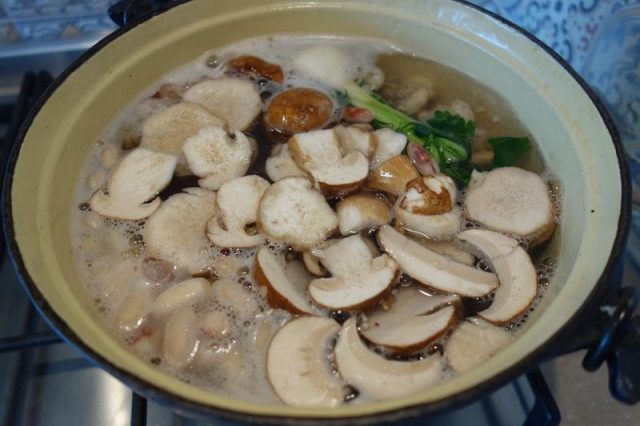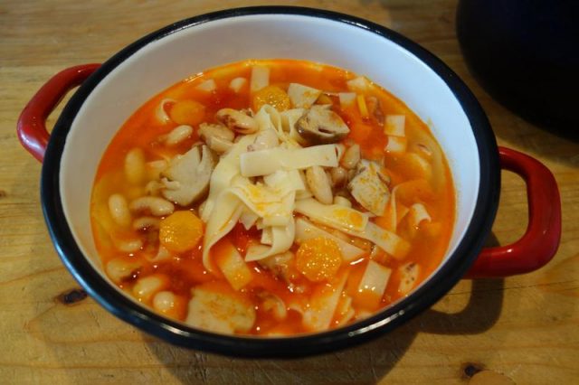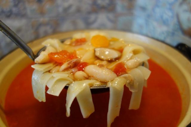 Noa, îngroșala asta cu ciapă pârgălită și fărina die mălai o pui în oală să mai deie cu zama on clocot bun. Amu tre să pui on blid die tomaji să hiarbă și ii în zamă. Tomaji mai laț să pui. Când o hiert și tomajii, nu mai trebe numa’ să pui uățăt, die crez că vrei să hie mai acră zama. Da asta cam așe tre să hie, mai acră!