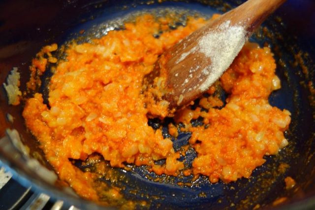 Taie mânânțăl ciapa și toptiești-o cu grije înt-o lingură die oloi. Punie păstă ciapa muietă o lingură bună die fărină die mălai cernută cum ț-am spus. Amestecă, frije-le o țâră laolaltă. Punie o lingură die poprică dulce și adaugă pă rând apă rece și fă o îngroșală la care poț punie, cătăcând o hiert, din zama caldă.
