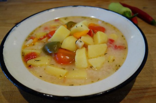 Noa, ni cum făciea: puniea ceaonu cu apă la hiert. Nu multă, cam on lităr die apă, on lităr și jumătatie. Până dădiea apa-n clocot corăța o ciapă, on morcod, unu, doi petrinjei, după cum ierau die mari, on dărab die țeler, die ave în colibă uări în gredinuța di lângă staul. Le tăie pă tăitie mânânțăl numa’ cu brișca lui, așe din mână le tăiea și le țâpa în apa clocotită. Da nu să răbda să nu puie în oală și o lingură die unsoare! Și frunza di la țeler. Le lăsa să hiarbă și să puniea să corățască picioicile. Cam o chilă die picioici. Le corăța, le spăla binie și le crepa, tăt cu brișca lui, di-a lungu o dată și încă odată crestul! Și țâniea în mâna stângă ale patru dăraburi strânsă căt-olaltă și le ciunta diodată tăt din doi în doi țenti. Ș-așe le tăie pă tăitie picioicile înt-o covecioară. Așe le tăiea, coștie! Cătăcând s-o hiert o țâră zărzăvatu puniea și picioicile tăietie. Da, naintie di-a punie picioicile, dacă ave, brișcălea și o thipărușe, nu tare mânânțăl. O lăsa și pă iea în oală. Noa! Și puniea picioicile și lăsa să hiarbă.