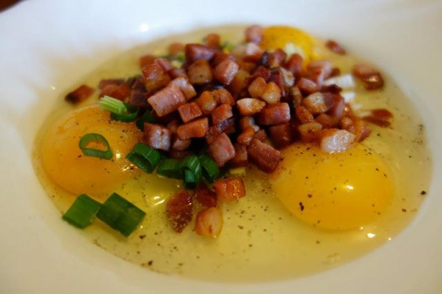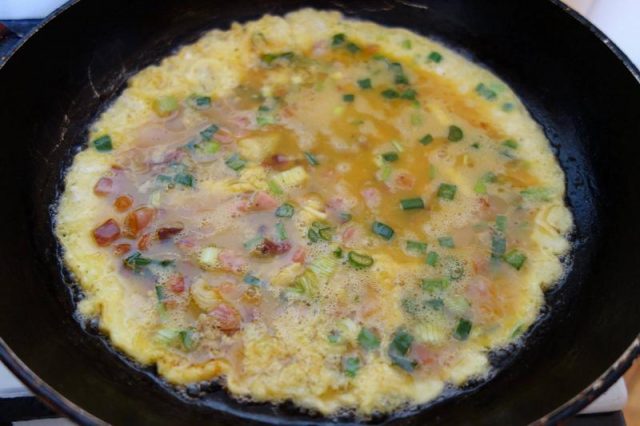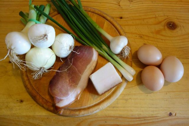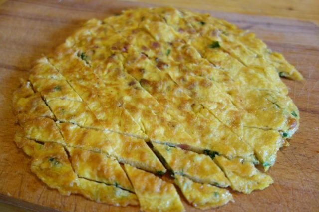 Noa, așe! Primaș dată faci o ratută, da nu die ceie zdrobdită! O faci așe cam ca o scovardă, ca o plăcintă. Să nu iasă uscată, trebe să hie mai puhabă… faci așe… tai on dărab die pecie afumată coșcuță mnici, tăt așe on dărăbuț die clisă afumată… aieste, di-ompreună, le cârcălești înt-o thigaie, așe diamăganu, fără oloi, fără unsoare că lasă iele… în vremea asta tai o ceapă mânânțăl, o ceapă așe mai mnică, o, die ai, tri hire die ceapă verdie. Când s-o cârcălit pecia și clisa, le scoț și le lași să să răcească. Baț bine înt-on blid tri uauă, pui thiperi și ceapa… nu punie sare că are bugătă pecia… amu pui și coscuțăle fripte și iar baț binie, binie uauăle că dacă le baț binie ptiar iesă ratuta puhabă. Întorci blidu cu tăt ce-i în iel în thigaie… ț-ajunje unsoarea ce-o rămas cum ai fript clisa și pecia. Focu blânduț, nu amesteci die fel. Pui fidieu pă thigaie ș-o lași așe on dărab die vreme… tie uiț la ratută și când gândiești o-ntorci fain frumos… ai grijă să n-o rupț… amu nu mai pui fidieu, încetuț, încietuț să face și pă ceie partie ratuta, o scoț din thigaie ș-o lași p-on lopitău să să hodinească.