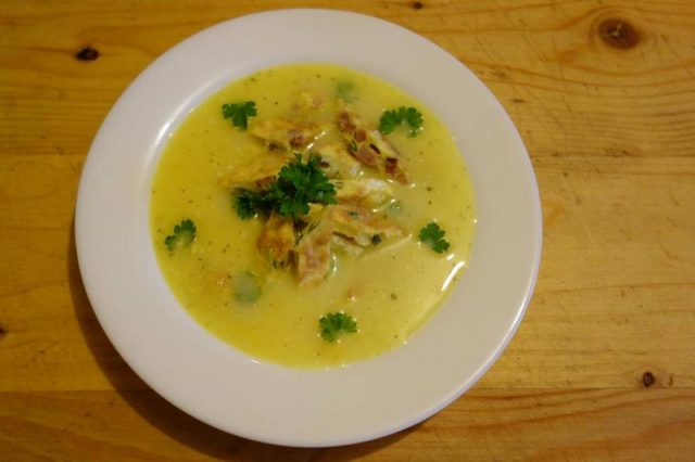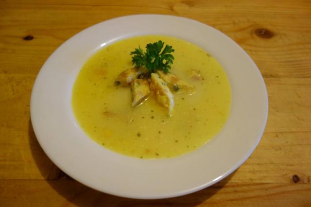Ș-amu ti-apuci die zamă. Tai mânânțăl tri cepe, toptiești o țârucă ceapa înt-o oală c-o ptic die oloi, amesteci una-ntru-una… pui apă uări zupă die carnie strecurată, die ai. Lași zama-n treaba ii să hiarbă și dai pă razalău cel mnic tri-patru cățăi die ai, îi pui și p-aiștia în oală. Vezi amu și die sare și punie și thiperi cât die binie. Când să moaie ceapa și aiu die mai nu le mai vezi, pui on păhăruț die uățăt die mere pădurețe uări die care ai în zamă, mai lași on clocot, duauă, pui ratuta pă care o-ai tăiet coștie, mai lași un clocot și traji oala di pă foc. Să nu care cumva să uiț die uățăt, că fără ala nu-i nicio ispravă, că zama-i dulce și nu-l ajuț cu nimnică pă ăl beteag! Amu pui înt-on castron o finjie die laptie prins și-l baț binie, binie cu tri gălbănușuri. Pui, așe pă rând și tăt amesteci, zama hierbinte, puțân câtie puțân, păstă laptele prins și tăt amesteci până a hi tăt cald ș-atunci îl sloboz în zamă, da tăt amesteci. Noa, la zama asta nu-i mai trebe nimnică!