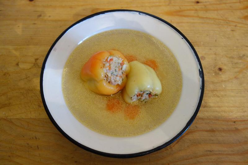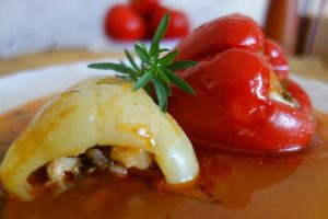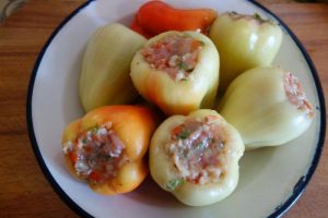Corățăști o ciapă dhigană ș-o thipărușe roșie. Le speli și le tai scrijele mari. Le friji în oloi numa’ cât să să moaie. După ce s-o răcorit o țârucă le dai pân moșina die tocat. Le pui iară în oloiu în care le-ai fript și pui păstă iele carnia ce o-ai luat di pă pticioare și pă care o-ai tocat și pă iea. Le amesteci, pui sare, thiperi, petrinjel verdie mânânțăl, iar amesteci și mai pui razalăi opăriț. Iesă on aluat fain numa’ bun die băgat în thipăruși. Thipărușile le aleji mai mânânțele, le speli, le tai on căpăcel așe cât să poț scoatie cotoru, le corățăști pă dinlontru die sămânță, or hi bunie numa’ die umplut!