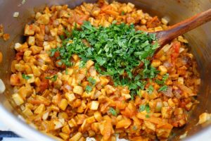 Da’ trebe să-ț spui că poț face zamă die thipăruși umplutie și die post. Mai ales amu că afli pân pădure atâitia hiribe. Ni numa’ cum faci! Tai mânânțăl o ciapă, tai coștie mnici o thipărușe, verdie, roșie, galbână, die care ai. Răzălești doi morcoz. Le pui pă tăitie înt-on laboș cu oloi și le călești. Pui sare și thiperi, poț punie și on colb die cimbru uscat. Pui păstă iele hiribele pă care le-ai tăiet coscuță mnici, mnici. Le mai friji laolaltă și să mai pui și o porodică răzălită uări tăietă. Poprica dulcie, petrinjelu și morareu verdie să nu lipsască! Dacă ai razalăi die post, adeca fără uou, punie o mână după ce i-ai opărit. Poț punie și rișcaș die n-ai razalăi. Mai pui și on uou să le țâie pă tăitie laolaltă. Noa, amu ai cu ce umple thipărușile pă care le corățăști cum ț-am spus. Da’ faci o zamă numa’ cu zărzăvaturi, în zama asta hierz thipărușile umplutie. Cătă când o hiert thipărușile pui o finjie die zamă die porodici, mai dai on clocot și ai gătat zama die thipăruși umplutie. Die post!